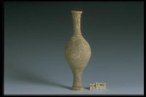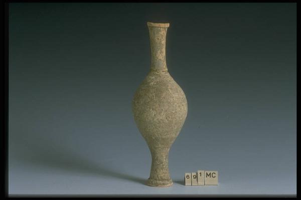Labbro dell'imboccatura svasato ad orlo diritto; collo tubolare a pareti legg. concave; corpo globulare allungato; piede dall'alto fusto massiccio a parete concava (un'inflessione nel punto di massimo rientro) con base espansa ad anello obliquo; fondo circolare pieno legg. concavo al centro; mazzi di scanalature appena sotto il collo e nella parte finale del corpo
