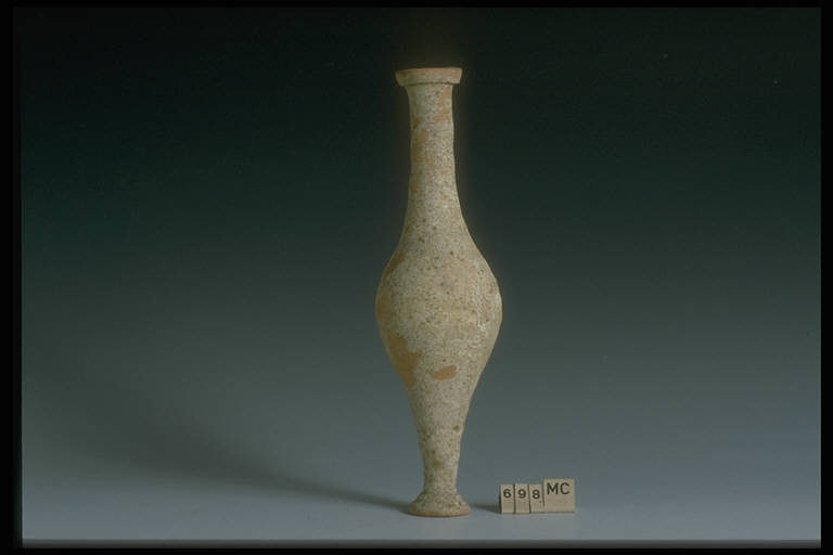 Pareti sottili; labbro dell'imboccatura espanso ad orlo verticale legg. svasato; collo tubolare; corpo globulare assottigliato; piede dal lungo fusto sottile, a parete obliqua rastremantesi in basso; base espansa troncoconica, divisa a metà da una piccola scanalatura e con la parte più esterna legg. ispessita; fondo pieno e piatto