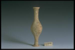 Imboccatura dal labbro aggettante ad orlo verticale diritto; lungo collo tubolare legg. svasato in alto; corpo globulare allungato assottigliato; piede dal lungo fusto sottile, tubolare, legg. svasato in fondo; base aggettante ad anello schiacciato, dal bordo superiore legg. rialzato; fondo pieno e piatto