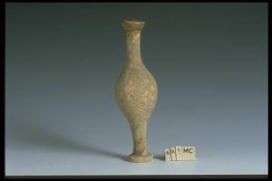 Parete sottile; imboccatura dall'orlo verticale svasato e convesso, con carenatura all'interno; lungo collo sottile tubolare; corpo globulare allungato; piede dal lungo fusto sottile, legg. svasato in fondo; base aggettante ad anello ispessito, fondo pieno legg. concavo al centro