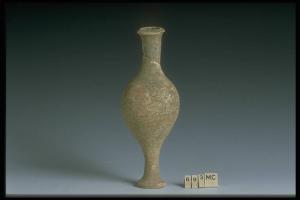Pareti spesse; imboccatura dal labbro espanso e pendulo verso il basso; collo abbastanza massiccio; corpo sferico, legg. rigonfio nella spalla; piede dal lungo fusto sottile; base aggettante ad anello schiacciato, fondo pieno e piatto