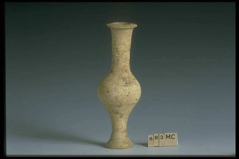 Imboccatura dal labbro piatto estroflesso; collo massiccio cilindrico; corpo sferico schiacciato, dalle pareti sottili; piede dal fusto a parete fortemente concava, svasato in fondo a guisa di trombetta; base ad anello obliquo ispessito, fondo pieno legg. concavo