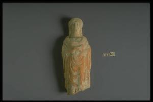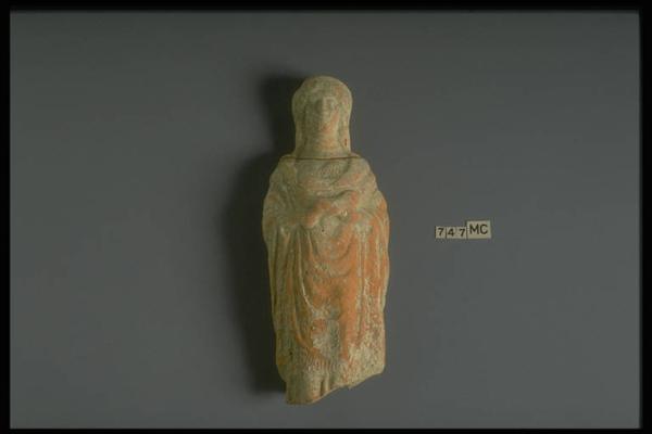 Figura femminile stante, panneggiata sul chitone a pieghe, con polos; le braccia son piegate sul seno a reggere un porcellino.