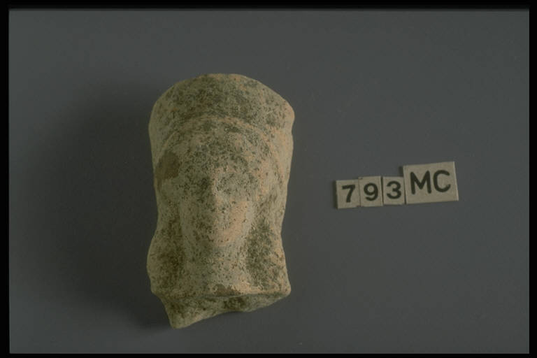 Testina femminile con capigliatura a ciocche disposte in due bande e polos.