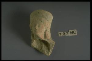 Testina femminile con capigliatura a ciocche disposte in due bande e polos.