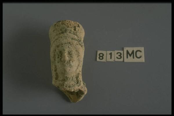 Testina femminile con capigliatura a ciocche disposte in due bande e polos.