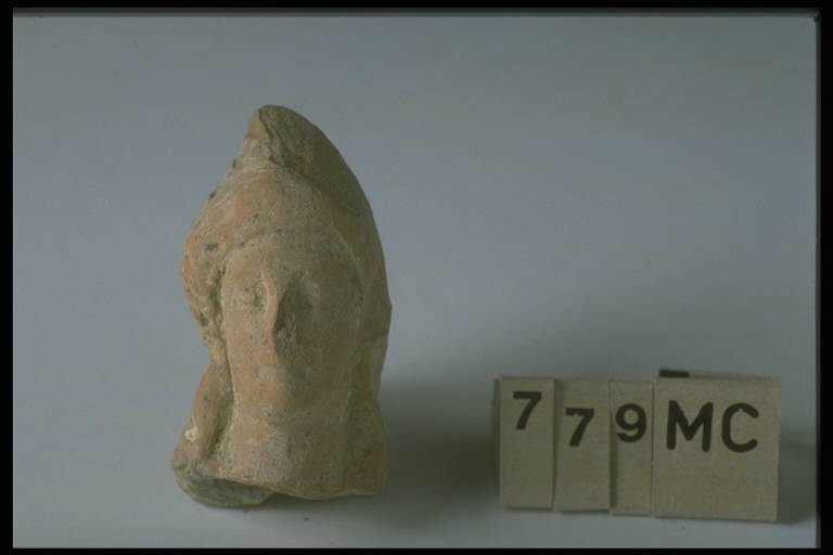 Testina femminile con complesso sakkòs a forma di turbante e capelli che scendono ai lati del collo.