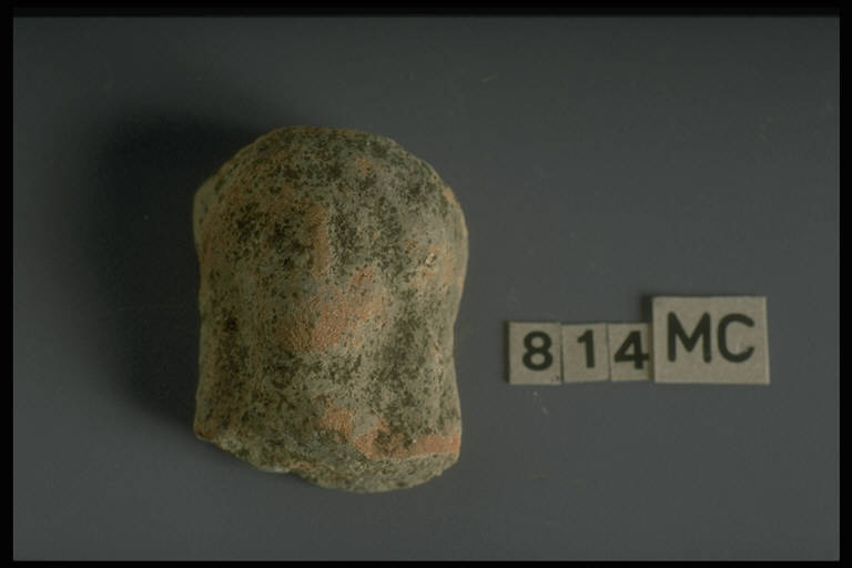 Testina femminile velata con capigliatura a ciocche disposte in due bande.