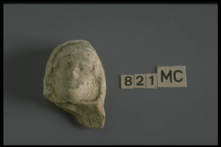Testina femminile velata con capigliatura a ciocche disposte in due bande.