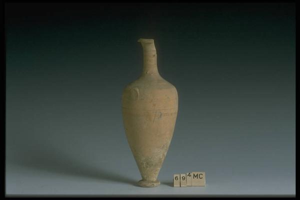 Imboccatura dal labbro espanso e pendulo verso il basso; lungo collo sottile tubolare; spalla obliqua carenata; due presine ad orecchietta alla base della spalla; corpo slanciato, di forma tronco-conica, con pareti sottili oblique rastremate in basso e legg. rientranti in alto; piede espanso a disco schiacciato, fondo circolare piatto