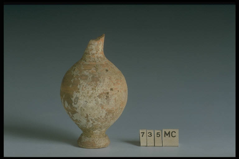 Collo tubolare a parete sottile; corpo globulare; corto peduncolo cilindrico; base tronco-conica, aggettante, con scanalatura all'attacco del peduncolo; fondo concavo umbelicato al centro; decorazione a larghe fasce di colore bruno, orizzontali e parallele, di diversa ampiezza