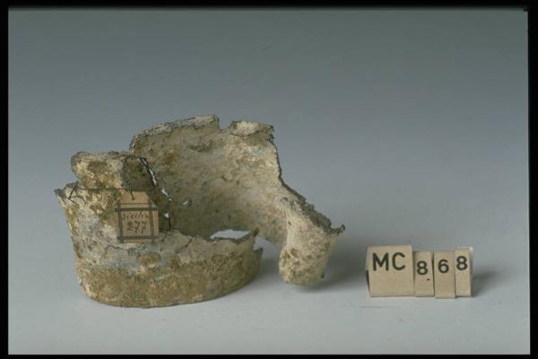 Forma circolare; uno dei due bordi (il superiore?) presenta una ripiegatura ad angolo retto verso l'interno