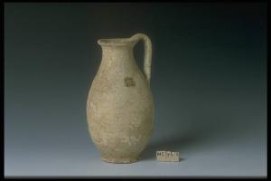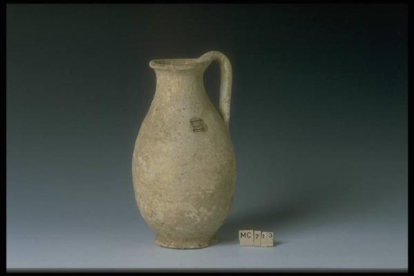 Imboccatura legg. svasata, dal labbro ispessito; collo largo a pareti concave; spalla non distinta; ansa verticale, non sporgente, spessa, a nastro, rialzata nel gomito, innestata all'imboccatura ed al ventre; ventre ovoidale, a pareti espanse; piede largo, troncoconico, con scanalatura di raccordo col corpo; fondo esterno legg. conico