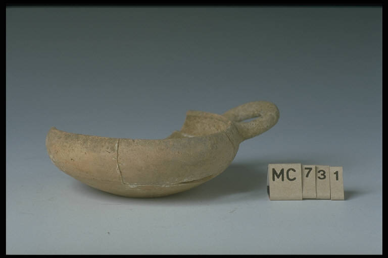 Imboccatura dal labbro sottile; vasca carenata, a parete sottile convessa sopra la carenatura, obliqua sotto; ansa orizzontale, a cordone, innestata appena sotto l'imboccatura e rivolta in alto; apoda: base piana segnata da un leggero aggetto dovuto ad uno schiacciamento della stessa; intorno al tondello centrale del fondo, mazzo di linee incise concentriche