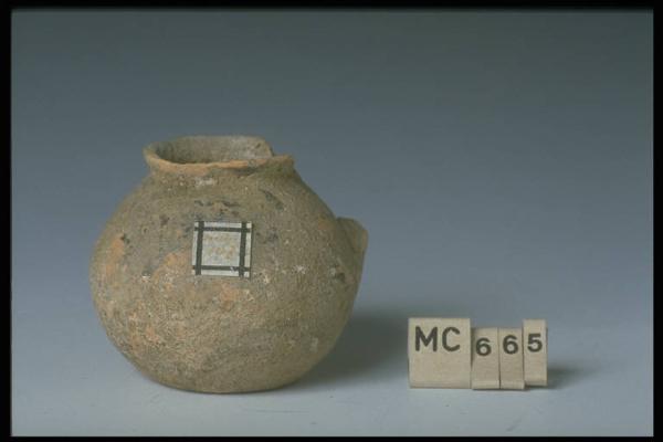 Imboccatura dal labbro verticale e svasato, separato dal corpo mediante una gola; presine ad orecchietta orizzontali, innestate nel punto di maggior espansione del corpo; corpo globulare schiacciato, a pareti espanse rastremantesi in basso; apoda. In origine verniciata