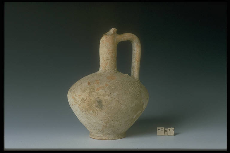 Imboccatura dal labbro estroflesso ed obliquo verso il basso; lungo collo tubolare; ansa verticale a nastro, con curvatura ad angolo pressoché retto, innestata appena sotto l'imboccatura e sul corpo; corpo carenato alla spalla, poi a profilo troncoconico; piede a disco legg. aggettante, con gola rientrata di raccordo col corpo, faccia esterna con rigonfiamento superiore poi a profilo diritto