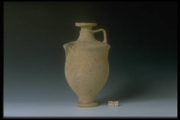 Imbocc. dal labbro espanso e verticale, con orlo legg. obliquo verso l'interno; collo troncoconico tagliato da un collarino aggettante; spalla espansa, obliqua, con carenatura a spigolo acuto; piccola ansa tubolare, verticale fra collarino e spalla, rialzata nell'angolo sup.; corpo a prof. concavo-convesso-concavo, rastremantesi in basso in un corto peduncolo; piede espanso ad echino rovesciato