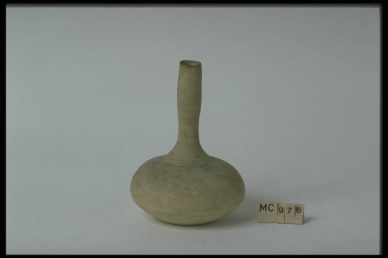 Il vaso ricorda nella forma una cipolla. Lungo collo sottile tubolare, a profilo concavo-convesso, legg. svasato in basso, distinto dalla spalla con una scanalatura; spalla obliqua a spigolo arrotondato; corpo biconico schiacciato; apodo