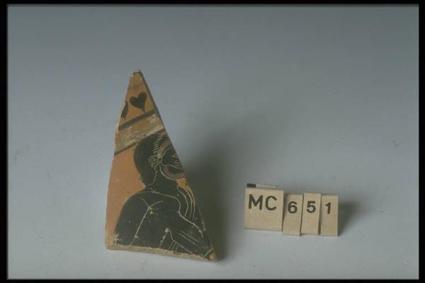 Figura maschile barbata di profilo a destra (restano: parte del viso, parte del torace).L'uomo indossa un mantello che passa sulla spalla sinistra ricadendo prob. sulla schiena, e tiene il braccio destro flesso in alto ed avanzato. Il busto sembra,