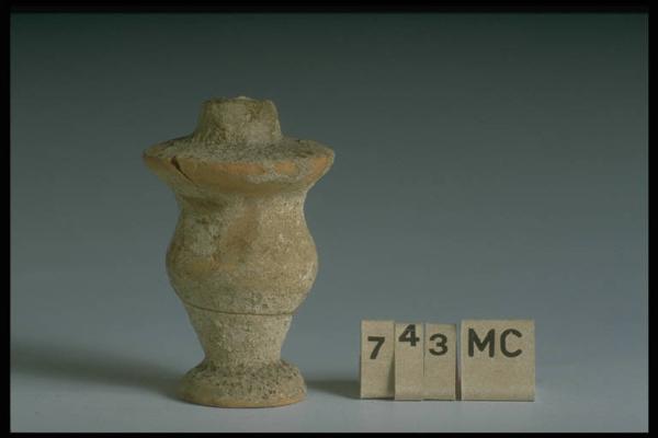 Forma c.d.samia: labbro a disco, collo cilindrico, spalla a disco espanso aggettante, corpo cilindroide con rigonfiamento, piede troncoconico; ansa a bastoncello.