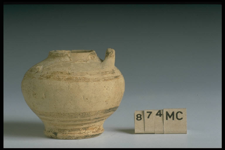 Orlo arrotondato verticale, corpo globulare compresso, piede ad anello, anse verticali a bastoncello.