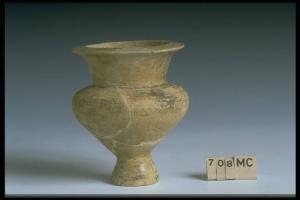 Piede troncoconico, corpo ovoidale rastremato, collo cilindrico, labbro piatto aggettante.