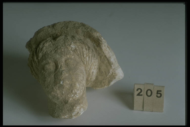 Testina femminile velata con capelli raccolti divisi in due bande; occhi profondamente incavati, labbra piccole e carnose.