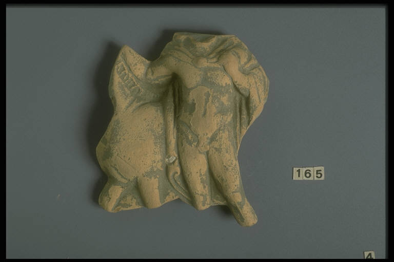 Frammento di pinax con Dioscuro stante: porta la clamide sulle spalle e regge le briglie di un cavallo
