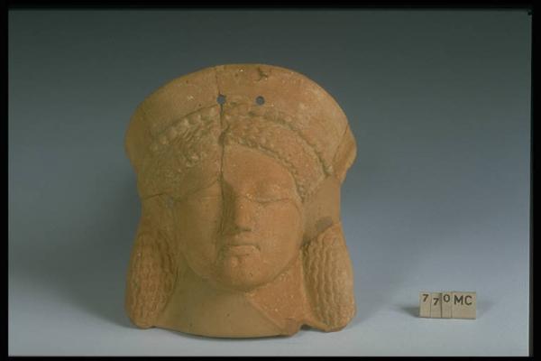 Testa femminile con capelli a ciocche divisi in due bande ai lati del volto e basso polos sul quale restano due fori.