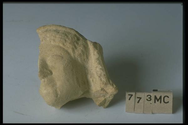 Testa femminile velata con capelli a ciocche divisi in due bande ai lati del volto.