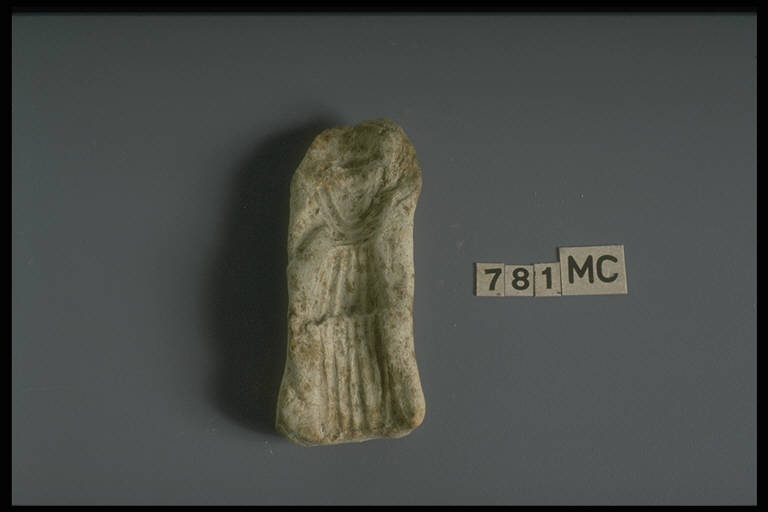 Figura panneggiata con un braccio sollevato (?) ed un elmo