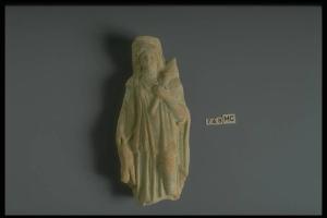 Figurina femminile stante, panneggiata, con polos e capelli che scendono in due bande ai lati del volto; nella mano destra un porcelino, nella sinistra una torcia.