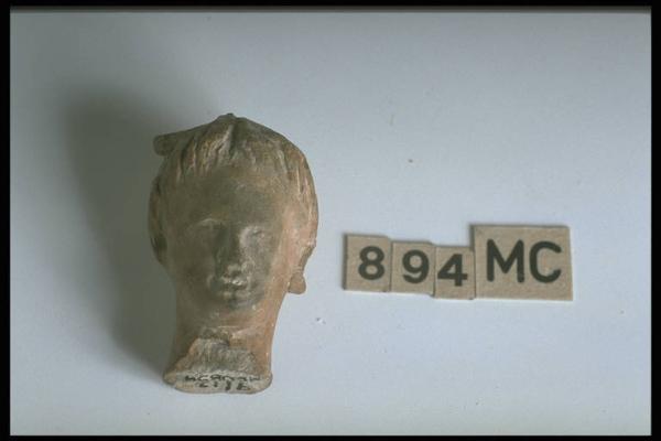 Testina di giovinetta con capelli raccolti a melone e orecchini a bottone