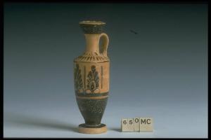 Bocchello troncoconico, collo cilindrico, spalla a tesa obliqua, corpo ovoidale, piede ad echino, ansa a nastro. Decorazione: doppia fila di linguette sulla spalla; sul corpo, nelle zona superiore, fila di tre palmette alternate a linguette verticali e delimitate da una base a ovoli.