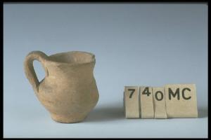 Orlo arrotondato estroflesso, collo cilindrico, corpo biconico, fondo piatto, ansa a nastro sormontante.
