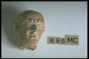 Testina di vecchio, calvo, sopracciglia aggrottate, bocca semiaperta.