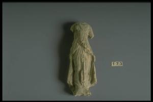 Figurina femminile vestita di lungo peplo con apoptygma; il panneggio aderisce alle gambe per allargarsi aul retro.