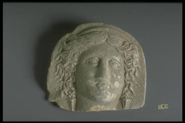 Lastra semiellittica con volto femminile di tre quarti, con diadema sui capelli divisi in due bande e orecchini a pendente piramidale.