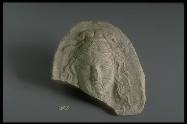 Lastra semiellittica con volto di Gorgone umanizzata e "patetica", frontale, capelli sciolti e mossi, in parte raccolti sul capo; alucce alle tempie e orecchini a bottone.