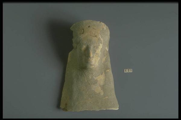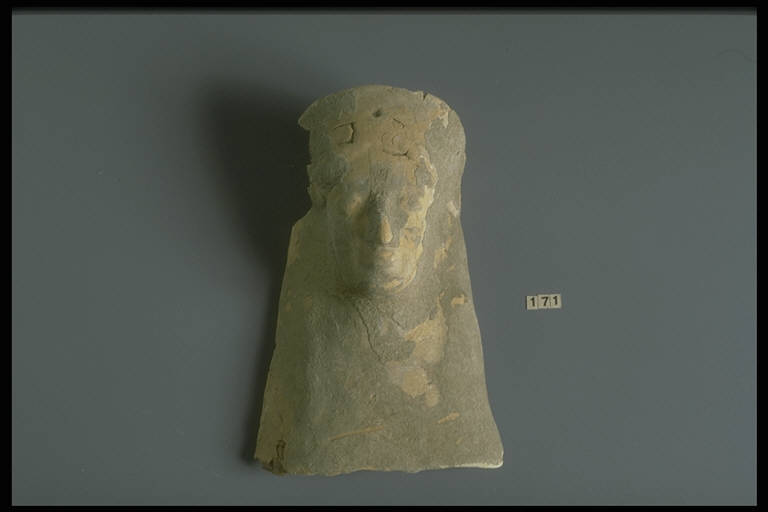 Busto femminile: volto con polos decorato da perline, collana a doppio giro di perle con pendaglio, capelli divisi in due bande che scendon con trcce sulle spalle.