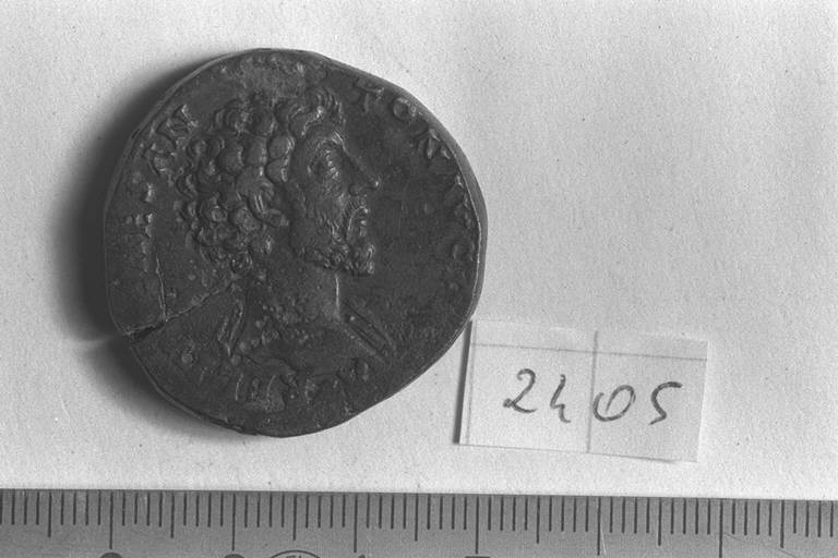 Recto: Bust a testa nuda, drappeggiato, di M. Aurelio, a destra . Contorno di perline.\nVerso: Felicitas, drappeggiata, stante, a sinistra, con caduceo nella destra e scettro verticale nella sinistra. Contorno di perline.