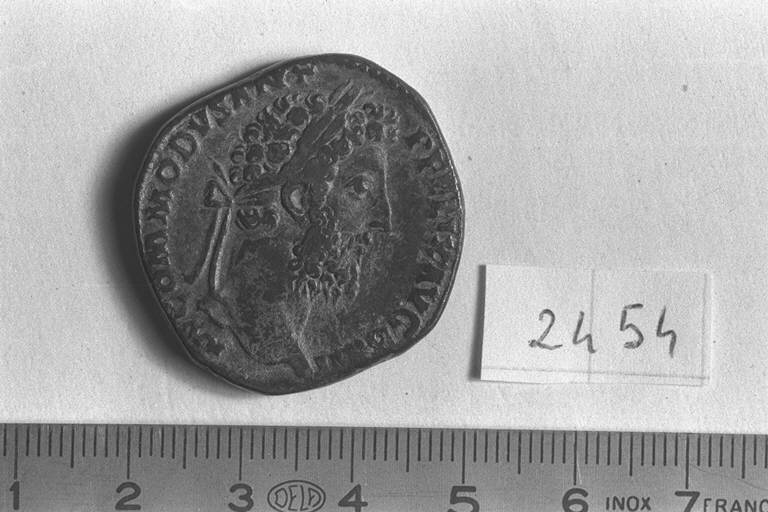 Recto: Testa laureata di Commodo, a destra . Contorno di perline.\nVerso: Commodo, togato, stante, a destra , con rotolo nella sinistra, stringe la mano al Genius Senatus, stante, di fronte a lui, rivolto a sinistra, con scettro corto nella sinistra. Contorno di perline.