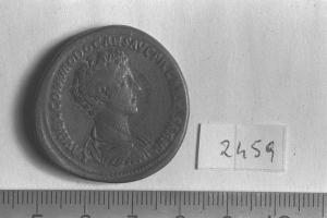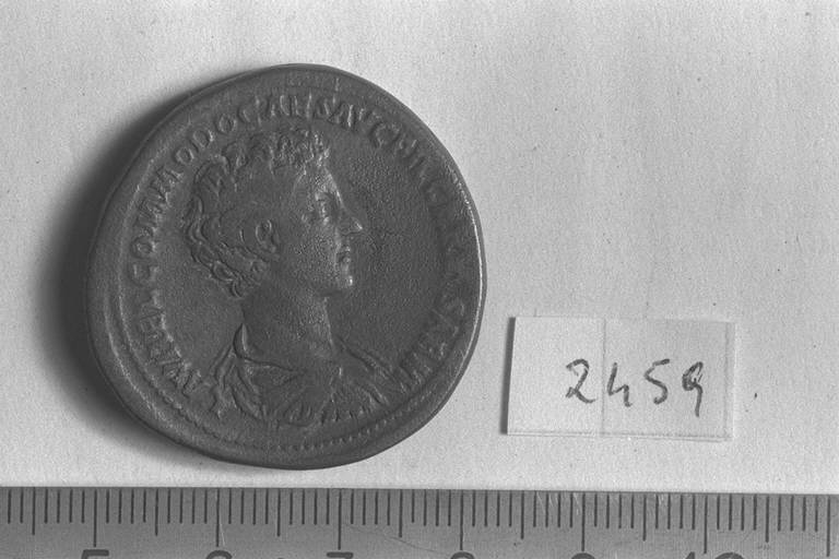 Recto: Busto drappeggiato e corazzato di Commodo, a destra , a testa nuda. Contorno di perline.\nVerso: Giove, con mantello fluttuante dietro il corpo nudo, stante, di fronte, rivolto a sinistra, impugna il fulmine con la mano destra tesa sopra Commodo, stante, a sinistra, e tiene lo scettro verticale nella sinistra; Commodo, togato, tiene la Victoria nella destra e il rotolo nella sinistra. Contorno di perline.