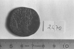 Recto: Testa laureata di Settimio Severo, a destra . Contorno di perline.\nVerso: Settimio Severo, in vesti militari, sulla sinistra, stante a sinistra, con globo niceforo nella destra protesa e lancia trasversale puntata in alto nella sinistra, in atto di essere incoronato dalla Virtus, sulla destra, con elmetto e vesti militari, stante, a sinistra, con parazonium nella sinistra. Contorno di perline.