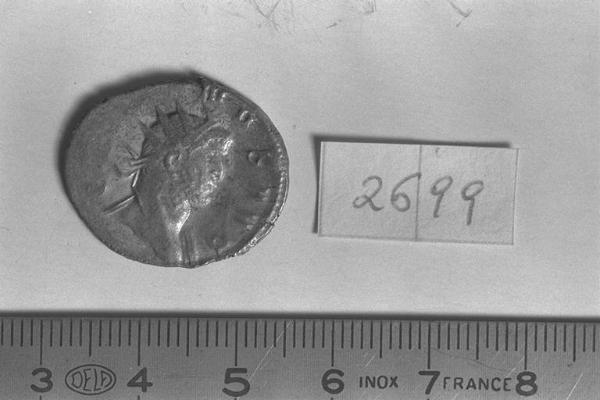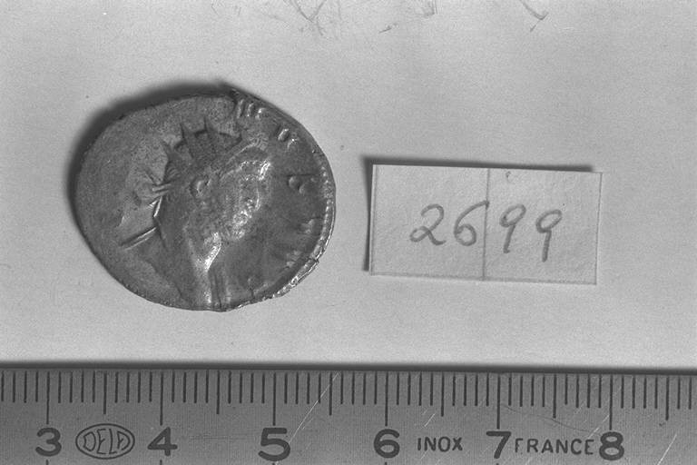 Recto: Testa radiata di Gallieno, a d, di spalle, con lembo di drappeggio sulla spalla. Contorno di perline.\nVerso: Giove, nudo, con mantello fluttuante dietro le spalle, stante, di fronte, rivolto a sinistra, con fulmine nella destra e scettro nella sinistra; ai suoi piedi, aquila stante retrospiciente. Contorno di perline.
