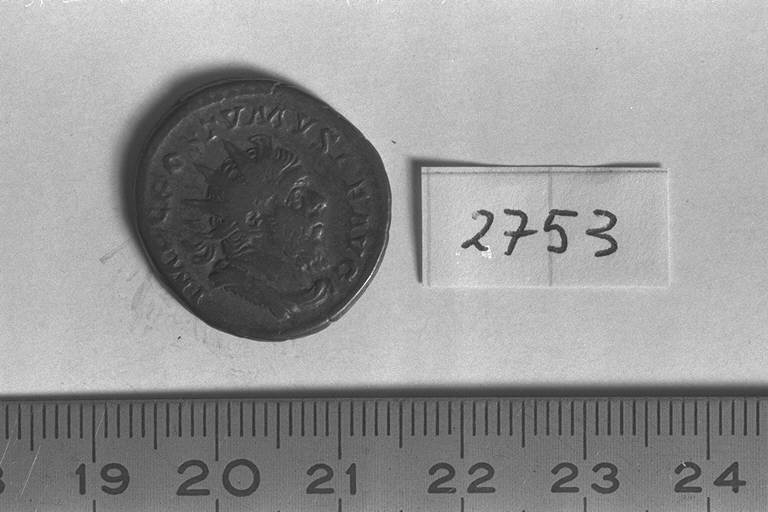 Recto: Busto radiato, drappeggiato e corazzato di Postumo, a destra , visto dalla fronte. Contorno di perline.\nVerso: Minerva, con elmo, drappeggiata, in corsa, a sinistra, con ramo nella destra levata, lancia e scudo ovale nella sinistra. Contorno di perline.