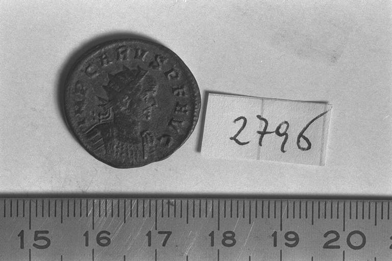 Recto: Busto radiato e corazzato di caro, a destra , visto dalla fronte. Contorno di perline.\nVerso: Spes, diademata, drappeggiata, gradiente, a sinistra, con fiore nella destra levata, solleva con la sinistra un lembo della veste. Contorno di perline.