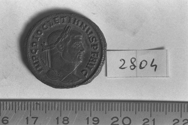Recto: Testa laureata di Diocleziano, a destra . Contorno di perline.\nVerso: Genius Populi Romani, nudo, con mantello che scende dalle spalle e modius sulla testa, tiene la patera nella destra protesa e la cornucopia nella sinistra. Contorno di perline.