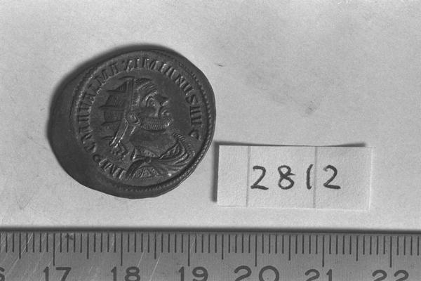 Recto: Busto radiato, drappeggiato e corazzato di Massimiano Erculeo, a destra . Contorno di perline.\nVerso: Ercole, nudo, stante, a destra , con clava e leontea collocata su roccia. Contorno di perline.