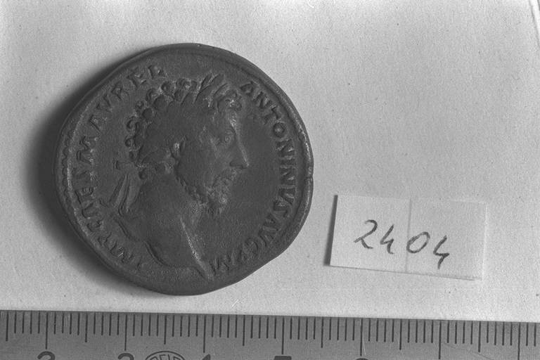 Recto: Testa laureata di M. Aurelio, a destra . Contorno di perline.\nR: M. Aurelio e L. Vero, togati, stanti uno di fronte all'altro, si stringono la mano, tenendo, ciascuno, un rotolo nella sinistra. Contorno di perline.
